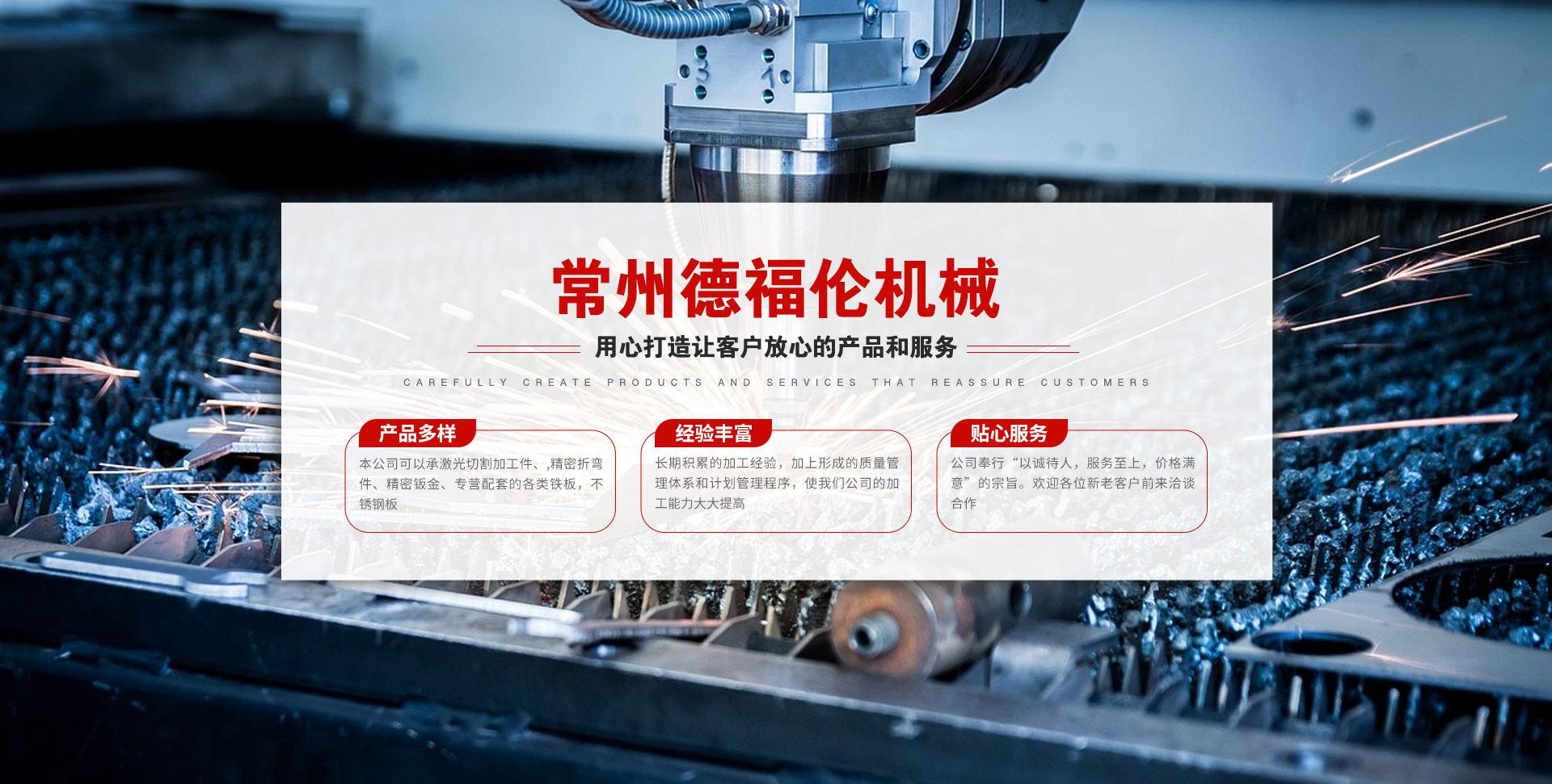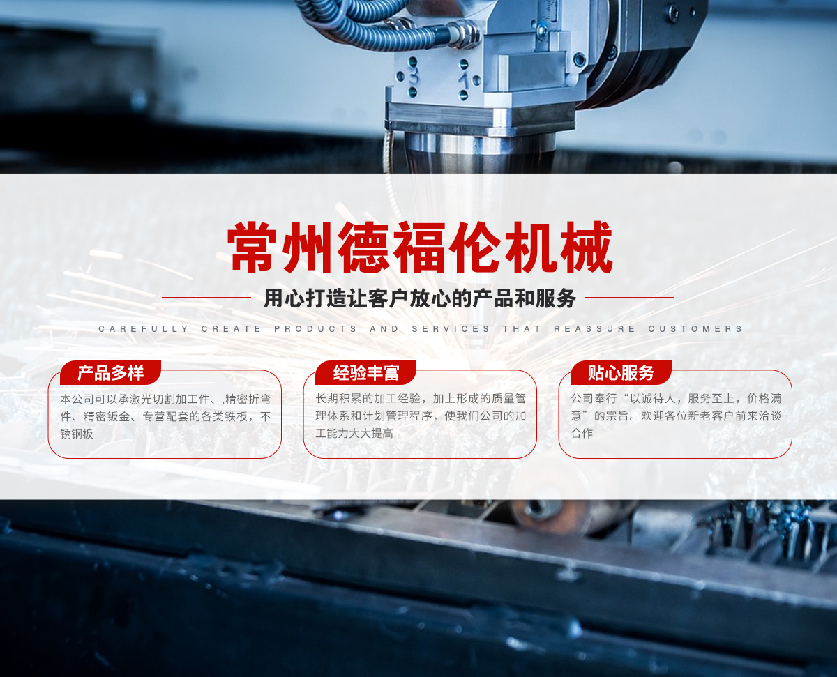 常州德福倫機械有限公司成立于2014年12月19號,位于江蘇省常州市武進區(qū)遙觀鎮(zhèn)建農村劍童路56號西門;公司配備;1萬瓦通K激光切割機1臺,6千瓦領C激光切割機1臺;機器行程6米*2.2米,切割不銹鋼50mm,碳鋼30mm;300噸大型數(shù)控折彎機。精密焊接機器數(shù)臺。本公司可以承激光切割加工件、,精密折彎件、精密鈑金、專營配套的各類鐵板,不銹鋼板。長期積累的加工經驗,加上形成的質量管理體系和計劃管理程序,使我們公司的加工能力大大提高,滿足客戶所需,是我們公司的目標!公司奉行“以誠待人,服務為上,價格滿意”的宗旨。歡迎各位領導;老總前來洽談合作!